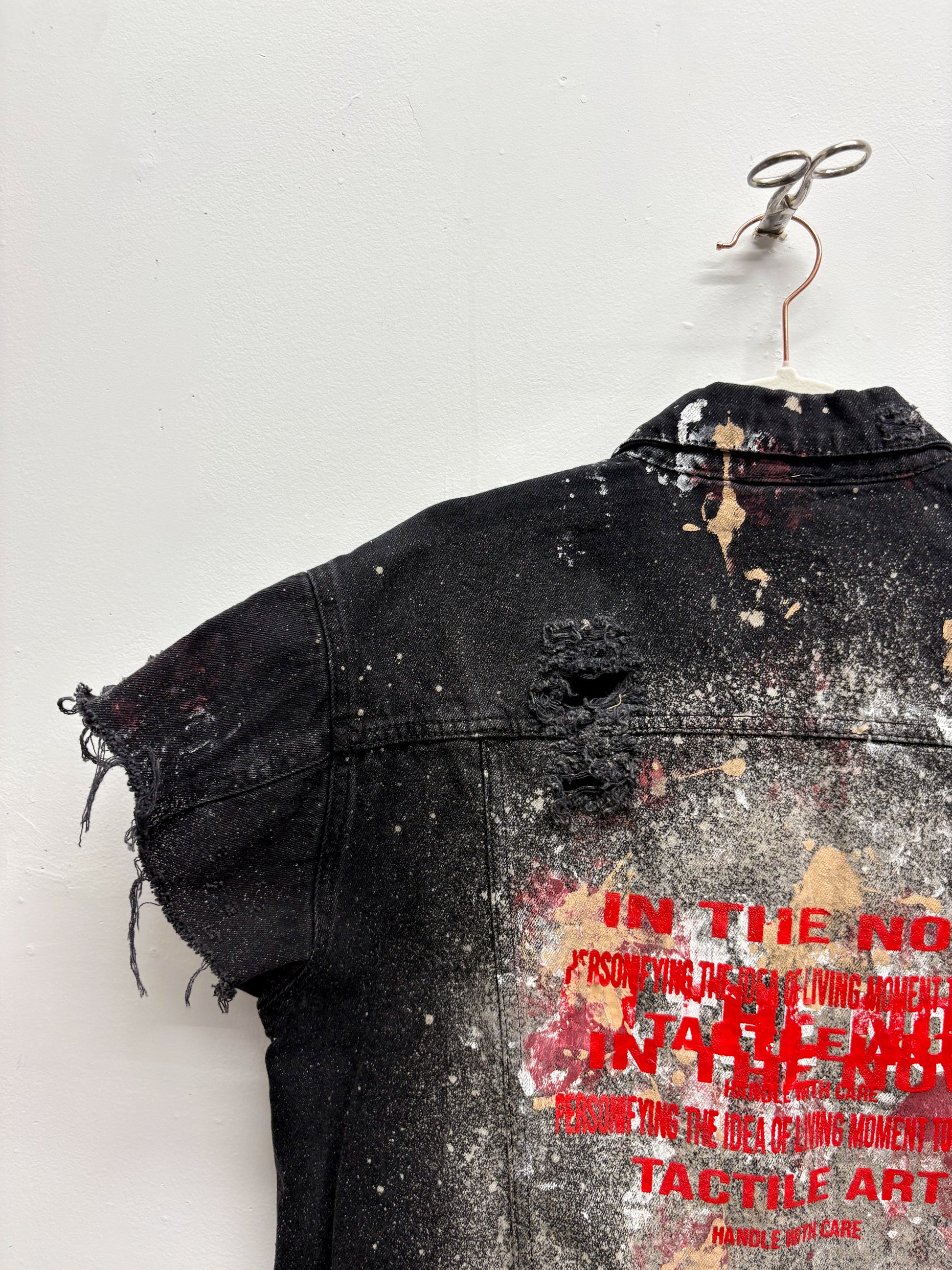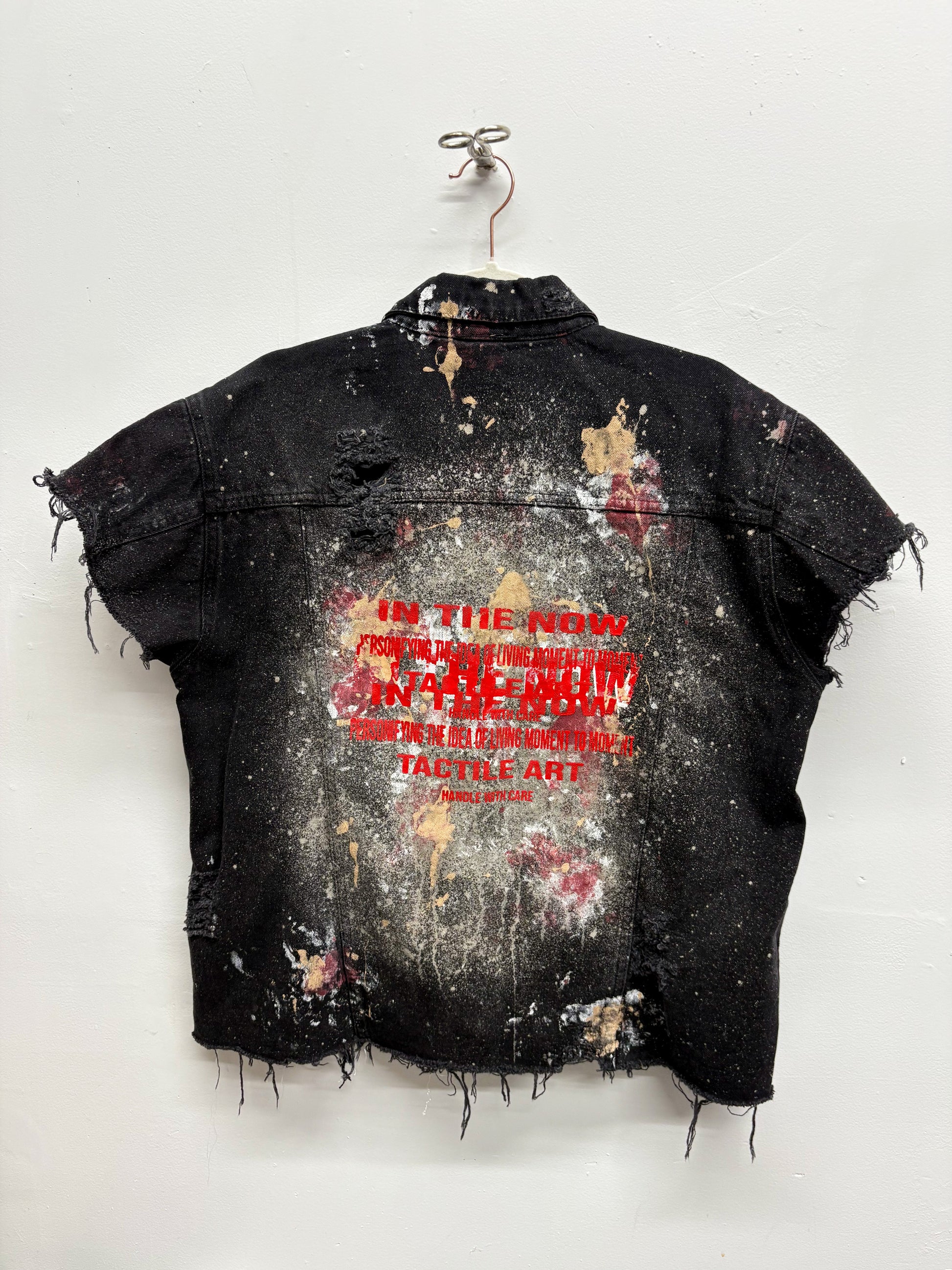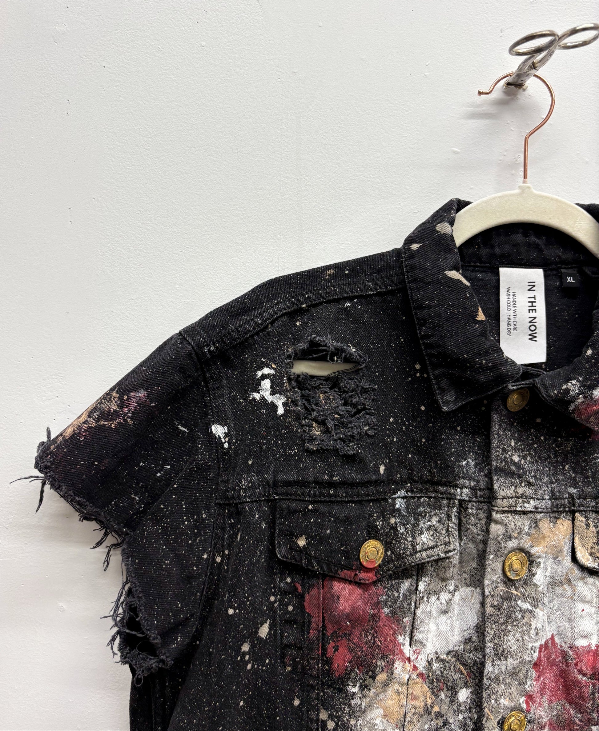 Crafted from premium black denim, this cropped cutoff features raw edges, deliberate hand distressing, and bleach and paint splatter detailing that add dynamic, one-of-one texture and tone. The structured cap sleeves offer a subtle architectural silhouette, while the double-printed back panel balances raw expression with intentional design.