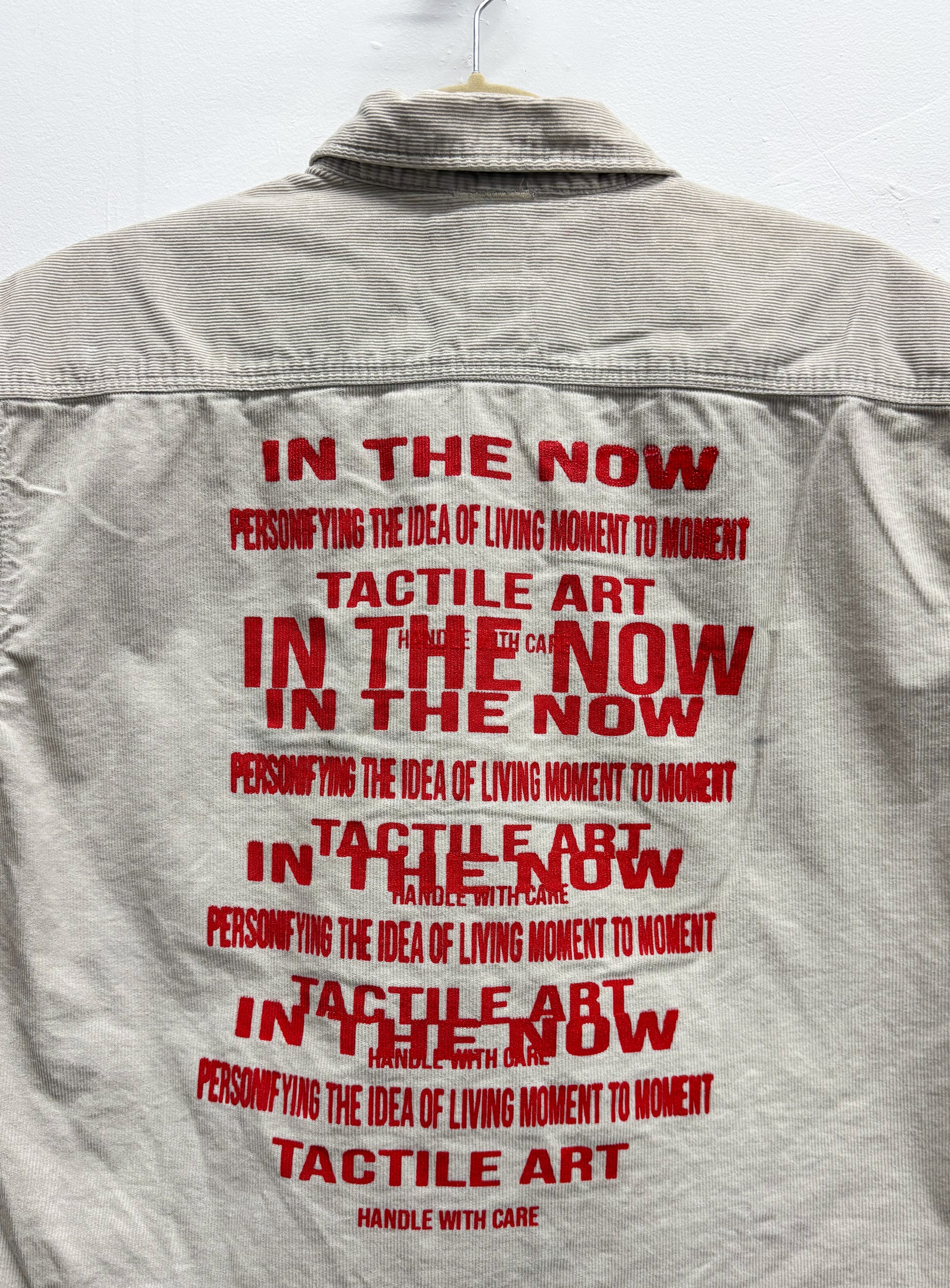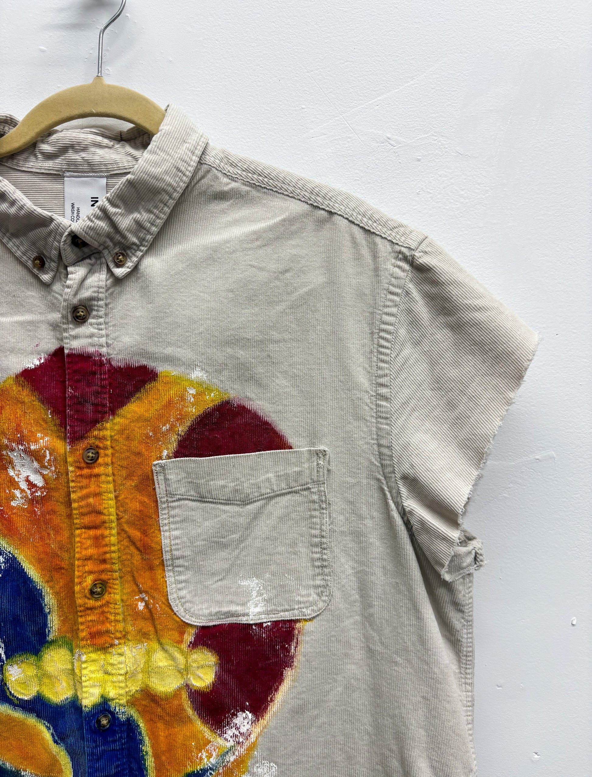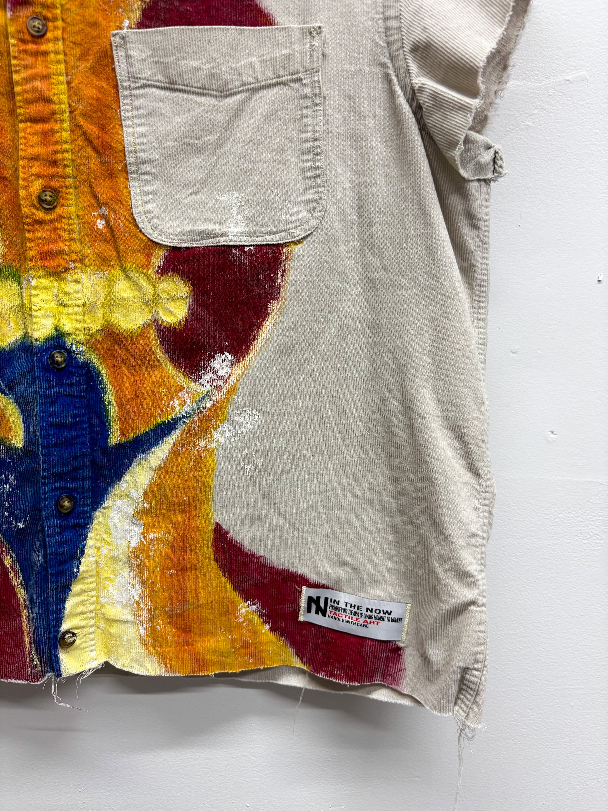 Crafted from mid-weight fabric, this oversized cropped overshirt is cut to cap sleeves with raw, unfinished edges for a rugged look. It features a hand-painted portrait on the front and multi-layered printing on the back panel, creating a dynamic interplay of art and craftsmanship in a one-of-one design.