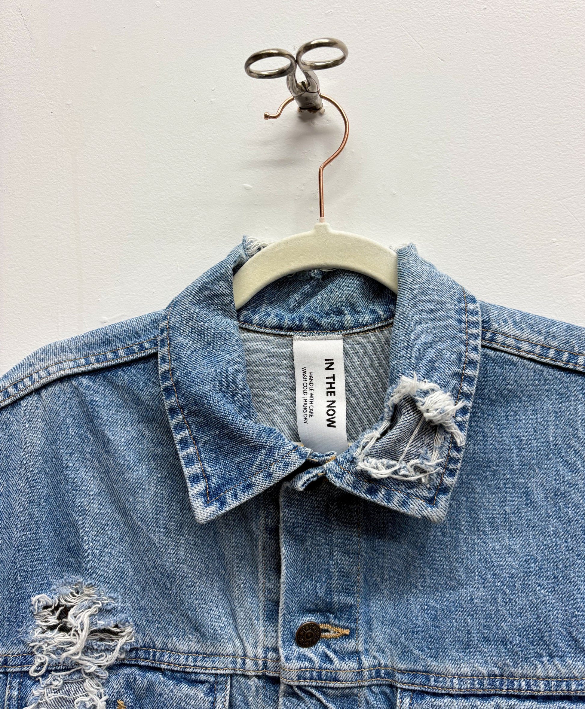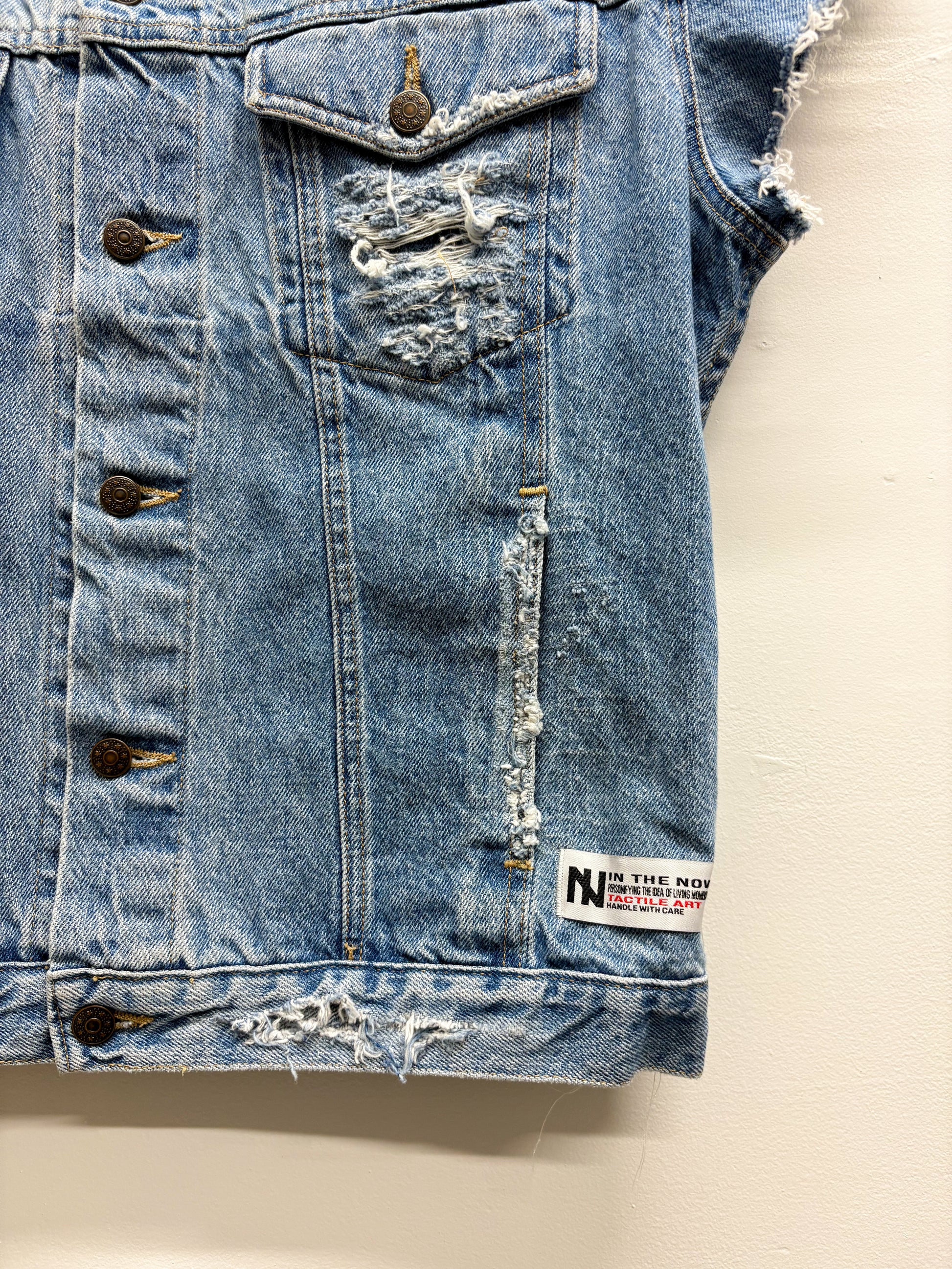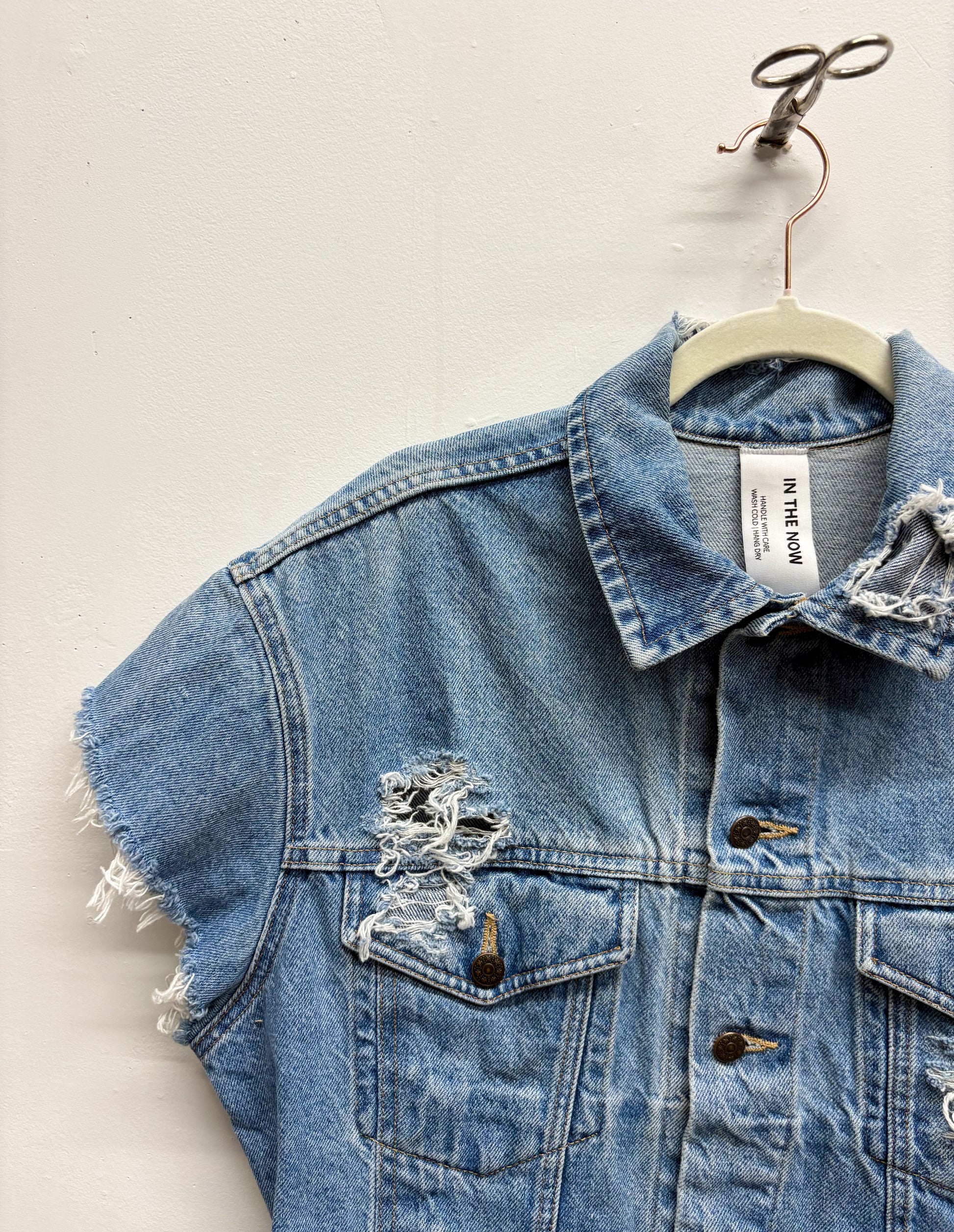 Premium blue denim crafted into a cropped silhouette with sleeves cut to form structured cap sleeves and finished with raw edges. Featuring intentional hand distressing throughout, this piece blends classic denim durability with a refined, architectural edge.